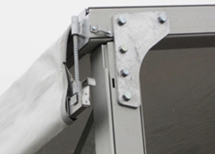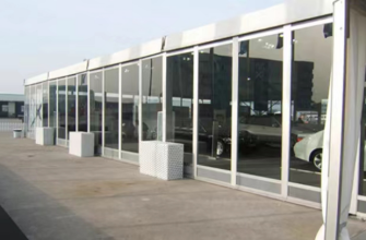 Paredes: Tecido PVC branco resistente de 650g/m2, semi-blockout, 100% impermeável, ignífugo (DIN4012 B1, M2), resistente aos raios UV.